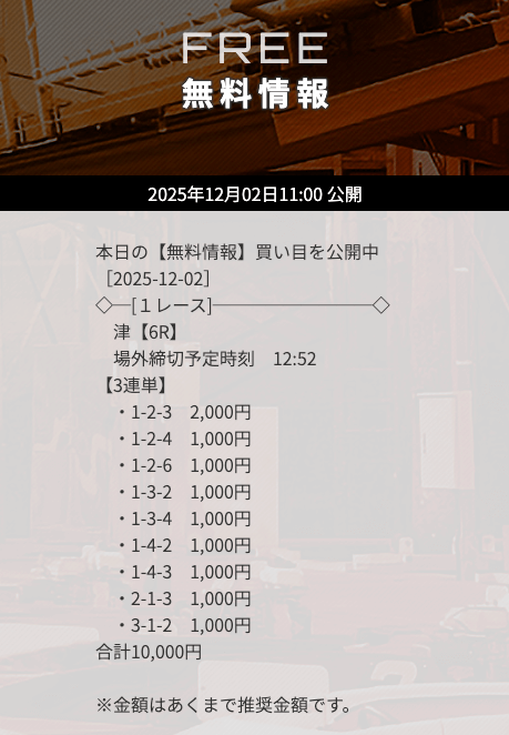 | 12月02日津06R | 1-4-3 | 10,000円 | 22,800円 | 228% | |