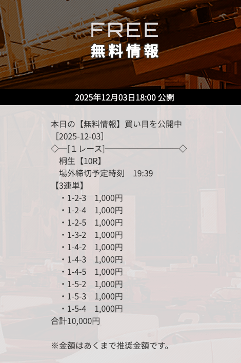 | 12月03日桐生10R | 1-5-4 | 10,000円 | 60,600円 | 606% | |