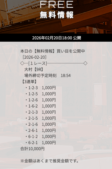 | 02月20日大村09R | 6-1-2 | 10,000円 | 23,200円 | 232% | |
