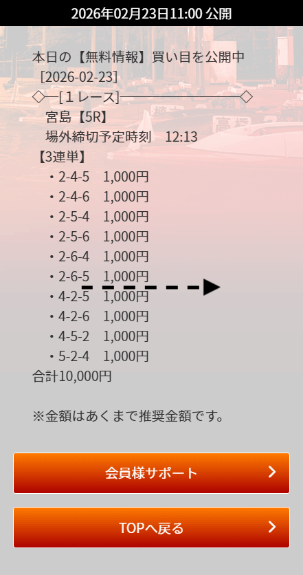 | 02月23日宮島05R | 2-6-4 | 10,000円 | 120,200円 | 1202% | |