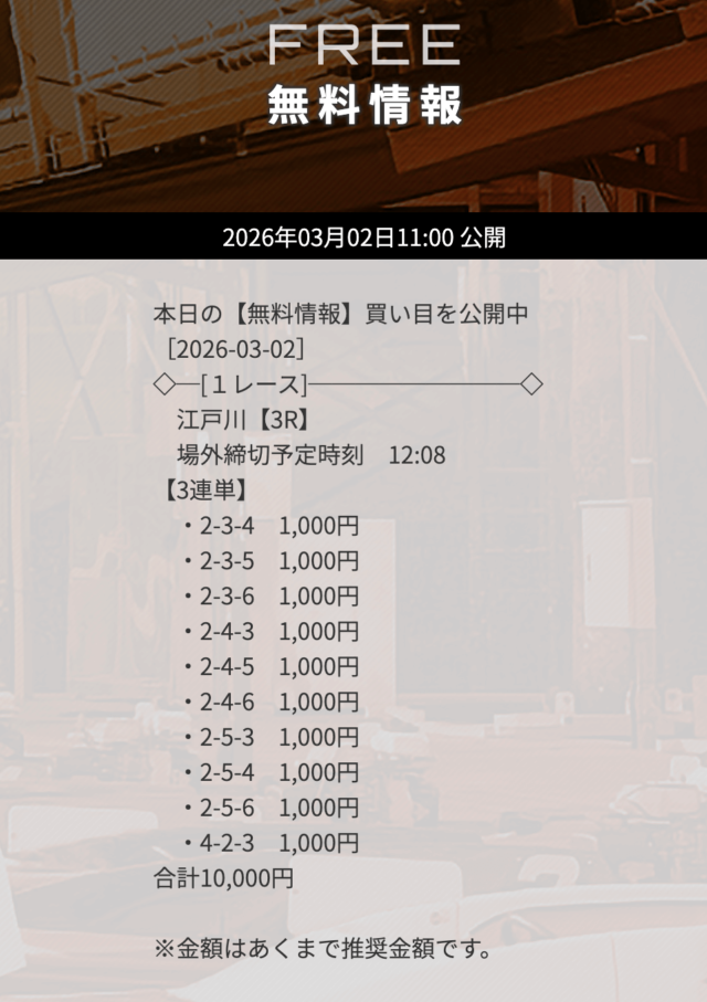 | 10月10日江戸川03R | 1-3-2 | 10,000円 | 16,950円 | 170% | |