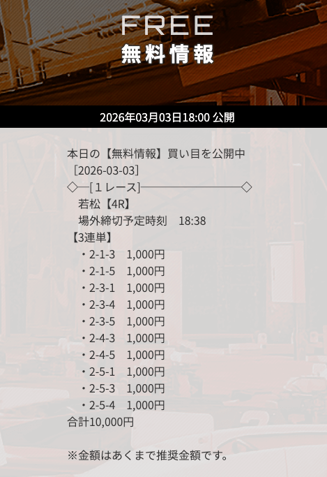 | 03月03日若松04R | 2-3-5 | 10,000円 | 12,200円 | 122% | |