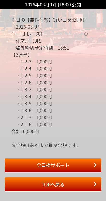 | 03月07日住之江09R | 1-3-6 | 10,000円 | 31,400円 | 314% | |