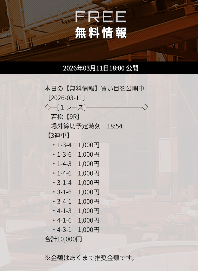 | 03月11日若松09R | 1-3-4 | 10,000円 | 11,200円 | 112% | |