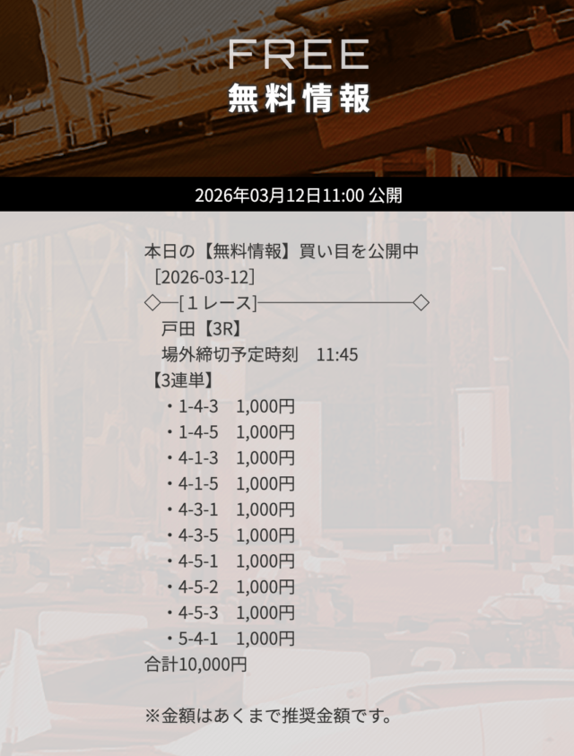 | 03月12日戸田03R | 4-3-5 | 10,000円 | 75,400円 | 754% | |