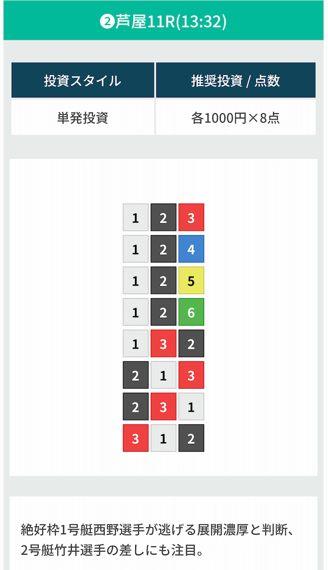 09月22日芦屋12R | 1-3-2 | 8,000円 | 12,400円 | 155% | |