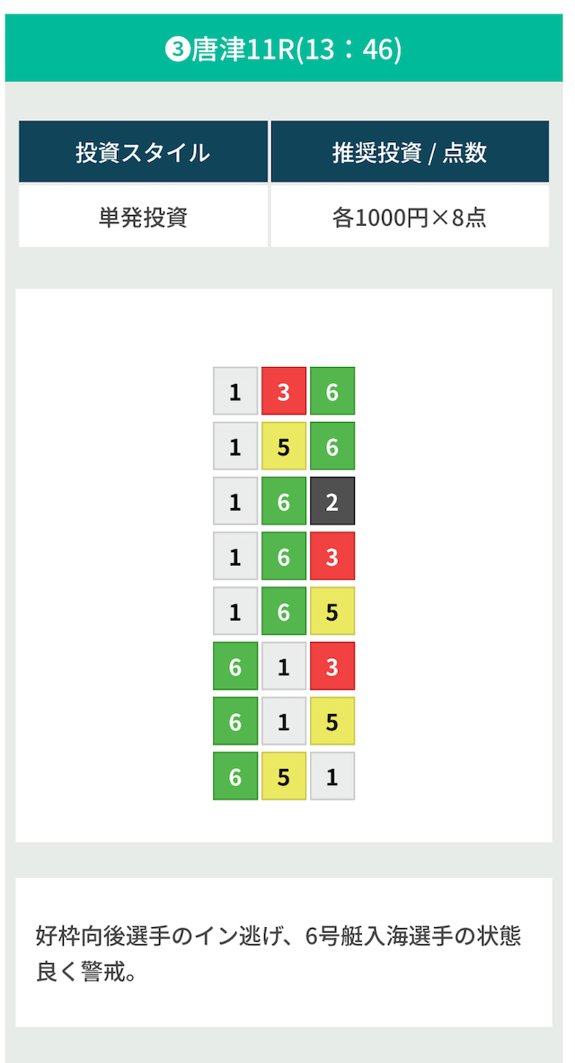 09月30日唐津11R | 1-3-6 | 8,000円 | 12,700円 | 159% | |