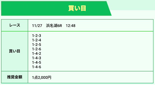 | 11月27日浜名湖06R | 4-3-5 | 16,000円 | 0円 | 0% | |