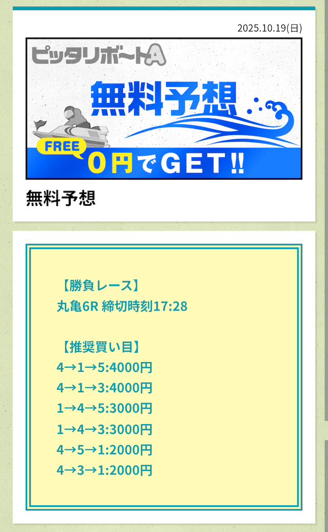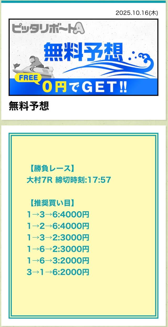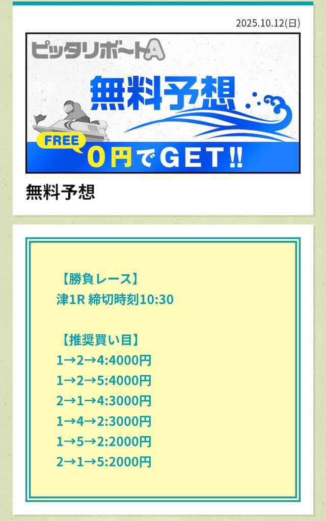 ピッタリボートAの無料予想は6点という少点数で公開されます。