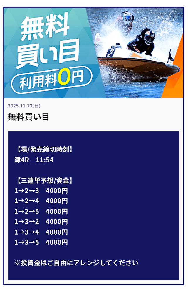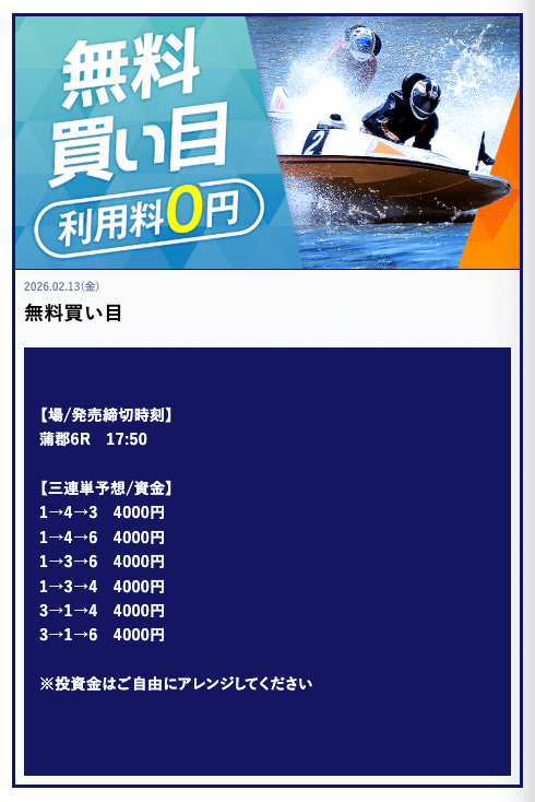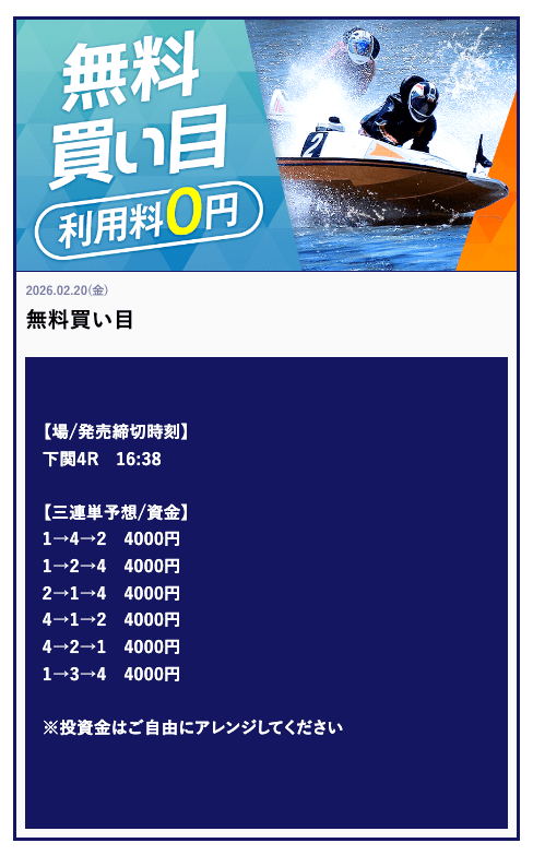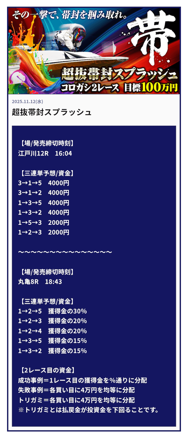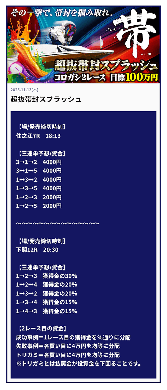 | 王の舟券/Rookコース | 18,900円 | 450,000円 | 23.81倍 | 2レース単発 |