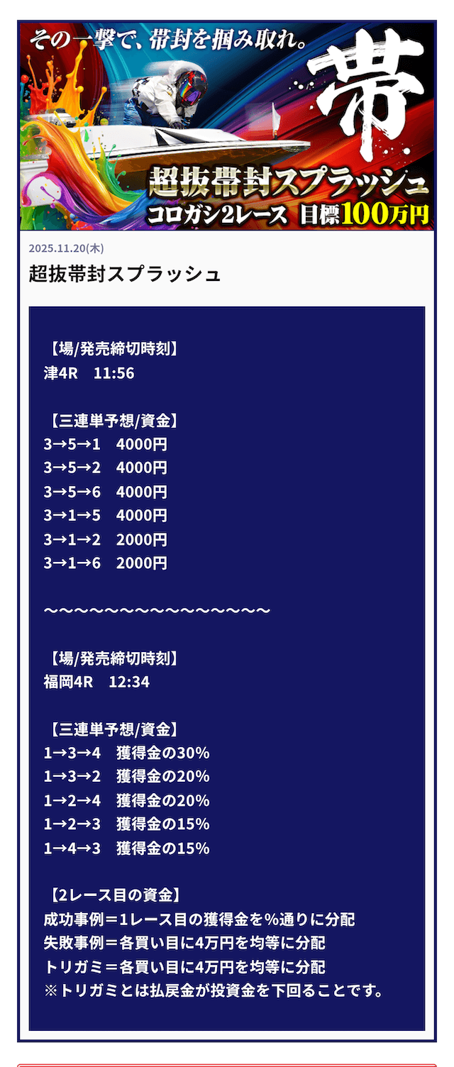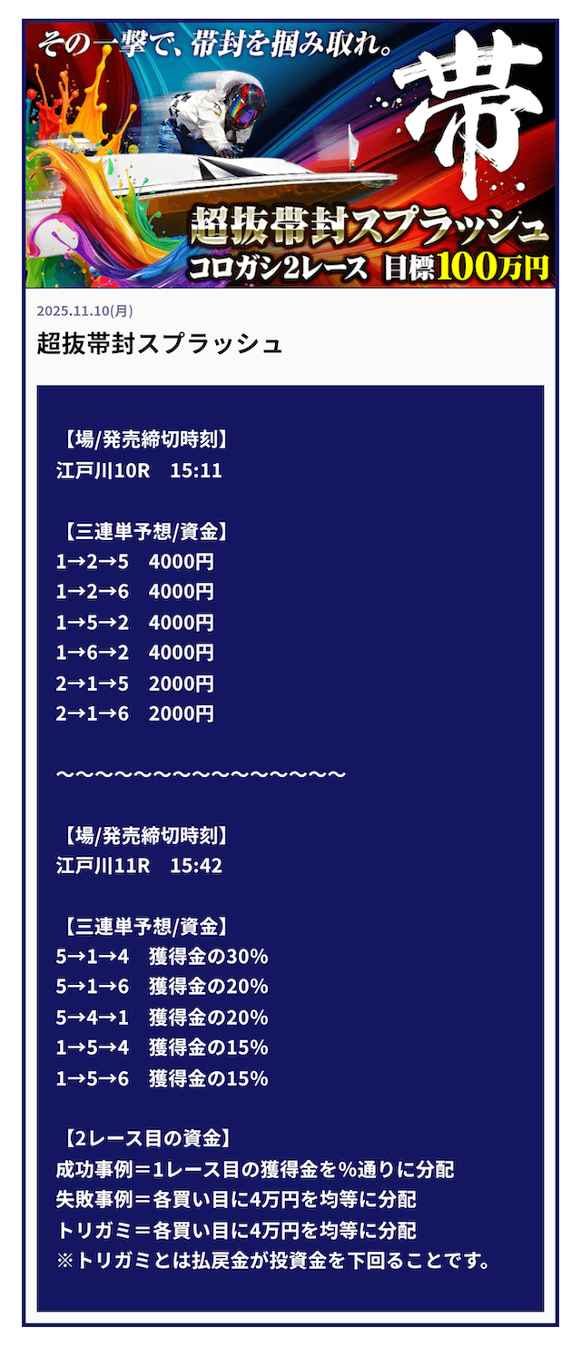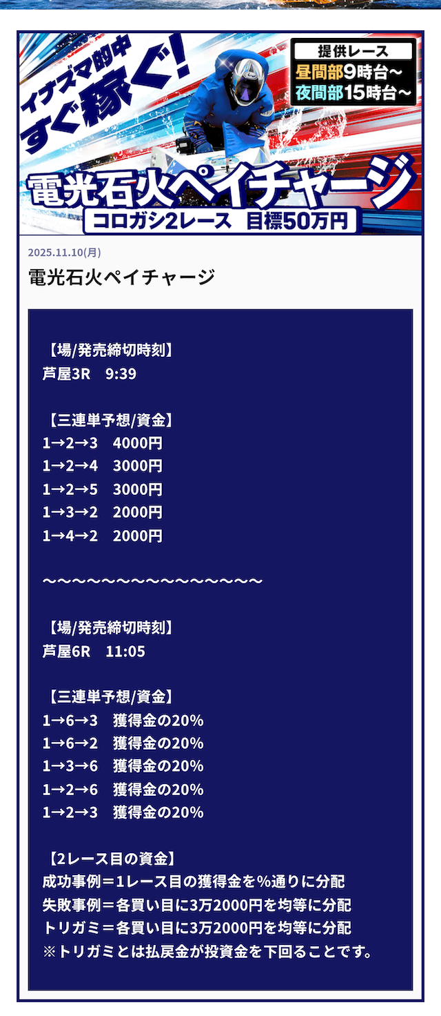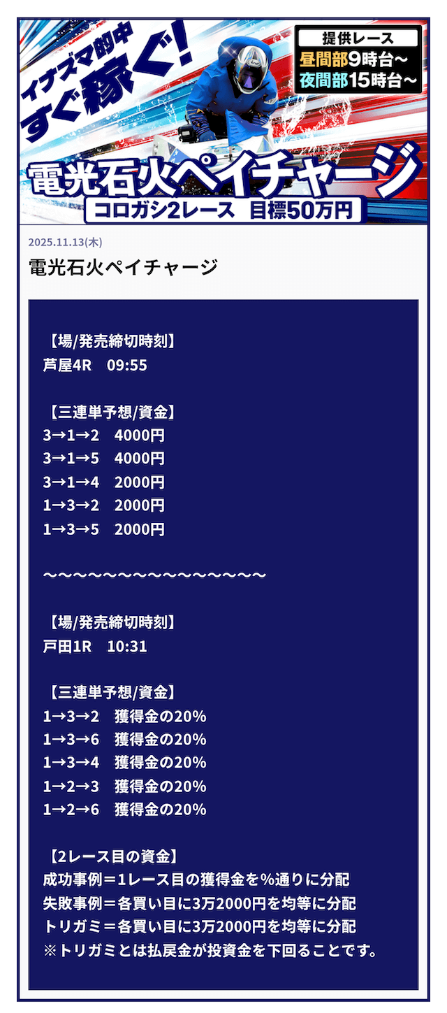 | 王の舟券/Rookコース | 18,900円 | 450,000円 | 23.81倍 | 2レース単発 |
