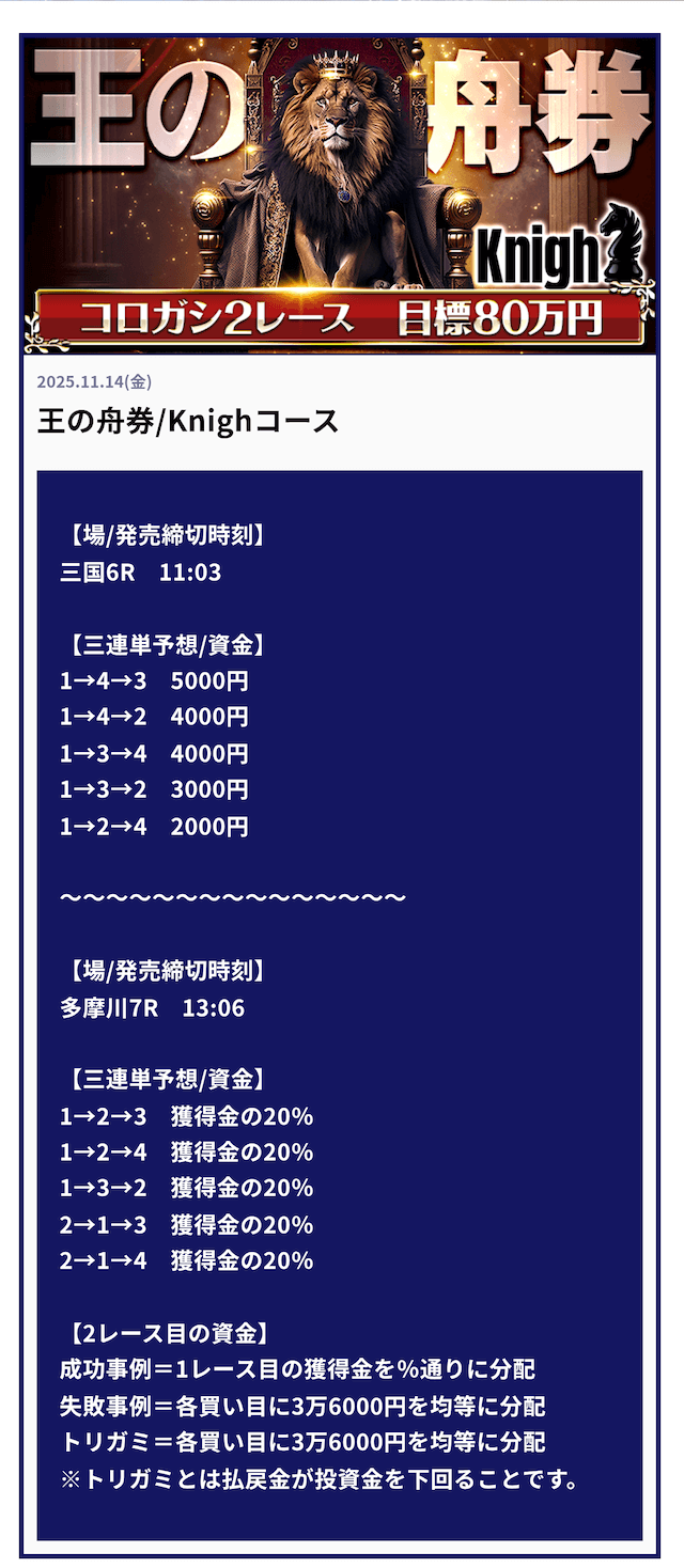 | 王の舟券/Knighコース | 23,900円 | 800,000円 | 33.47倍 | 2レースコロガシ |