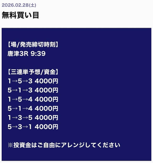 リスク管理がしっかりしていると感じる。提供される買い目が点数を絞りすぎず、堅実な的中を狙っているのが伝わります。
