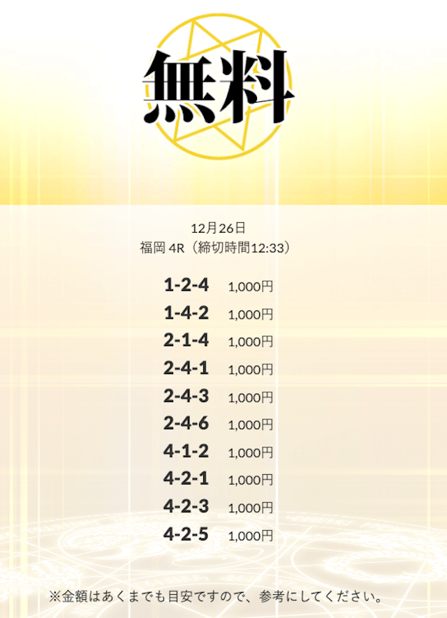 | 12月26日福岡04R | 4-1-2 | 10,000円 | 17,600円 | 176% | |
