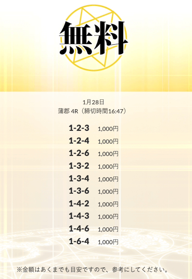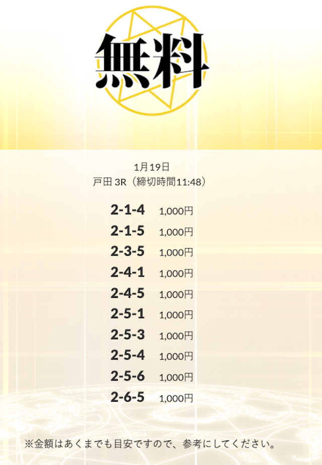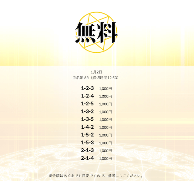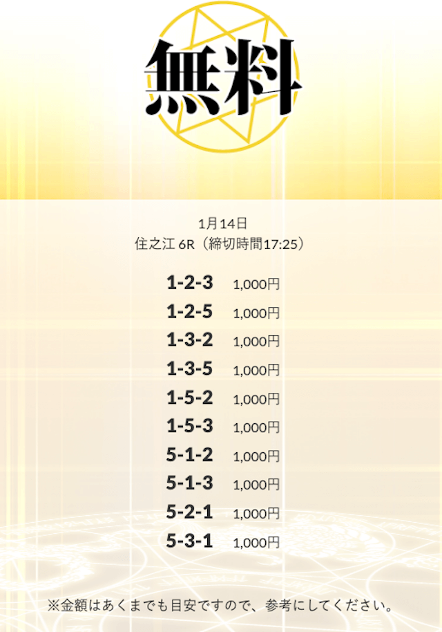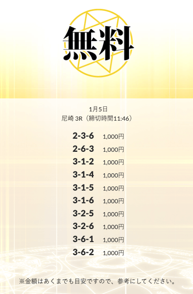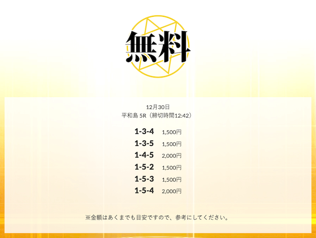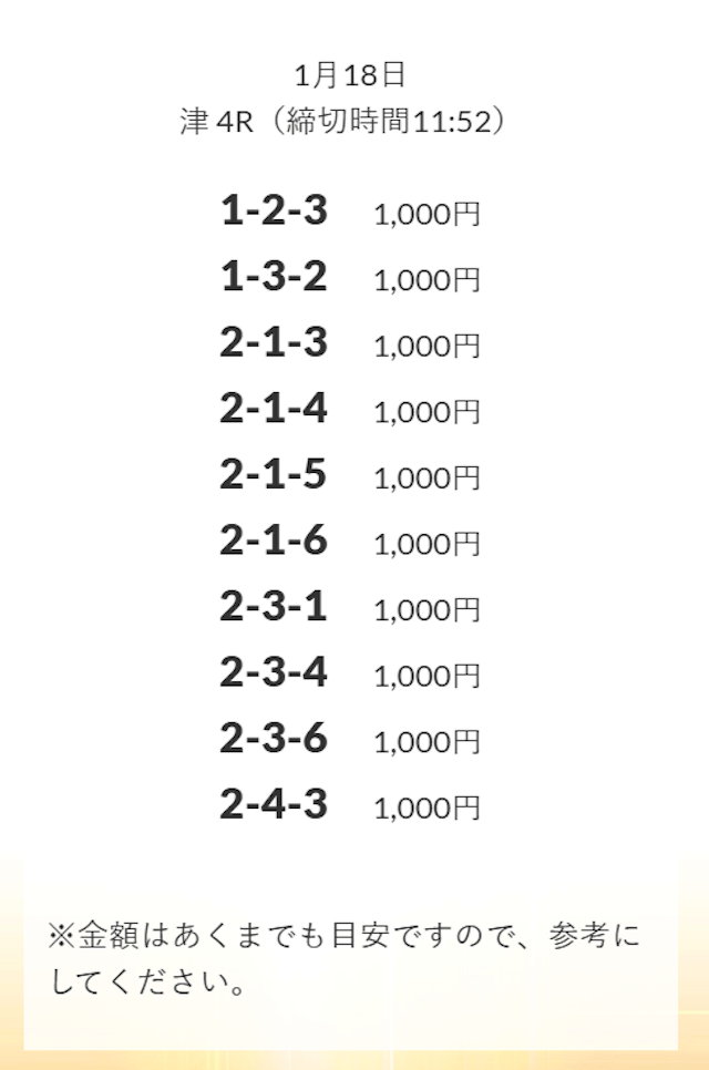 基本的には3連単6点の予想。投資金額は買い目ごとに変えているのでトリガミも起きにくくなっています。また、買い目は堅実ながらも穴狙いの予想も含めることから、時に大きく稼ぐことができます。