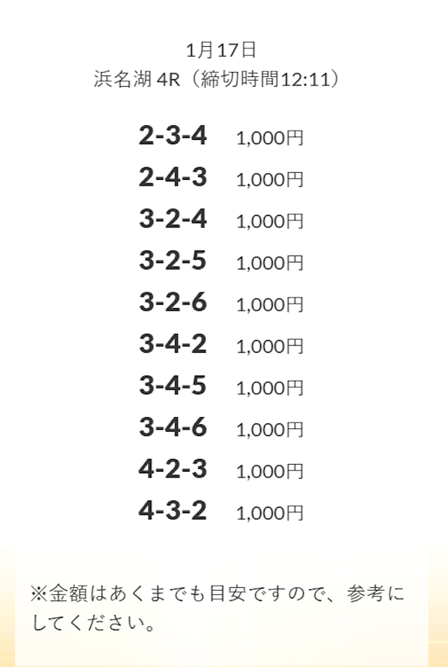 | 01月17日浜名湖04R | 3-2-4 | 10,000円 | 13,300円 | 133% | |