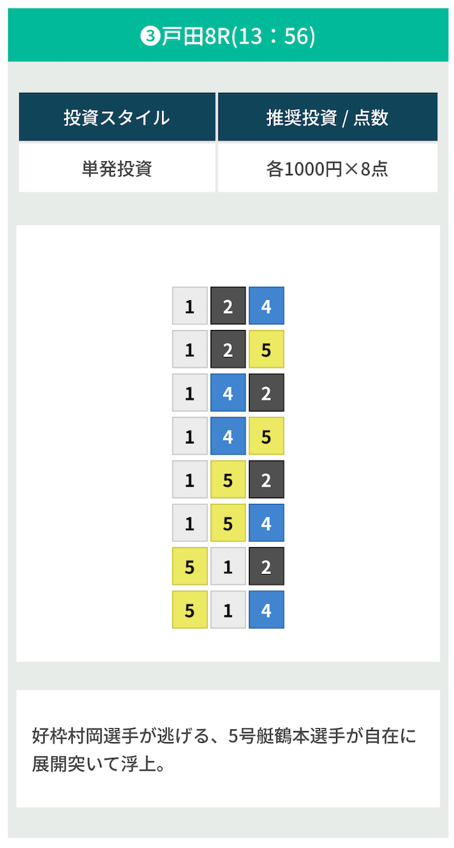 当てやすいレースを厳選しているため、1号艇の1着予想が多くなっています。時には5号艇や6号艇の選手を軸にすることもあり、なんと勝率は驚異の100%。外枠の選手を軸にする際は、確実に勝てるという明確な根拠があるということなのでしょう。また、高配当にもなりやすいため、競艇ジェットが5,6号艇を軸にした予想は狙い目の一つと言えます。