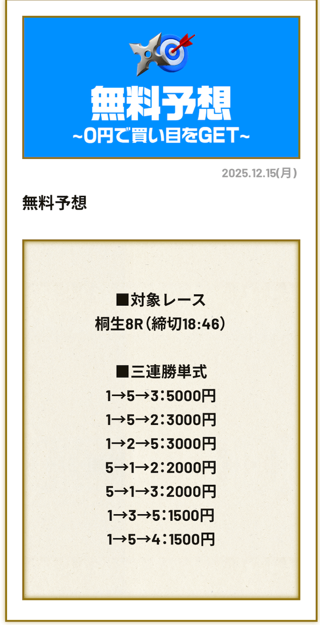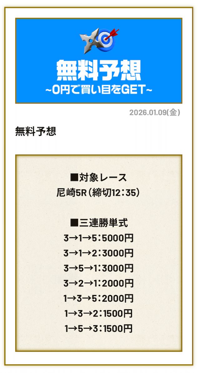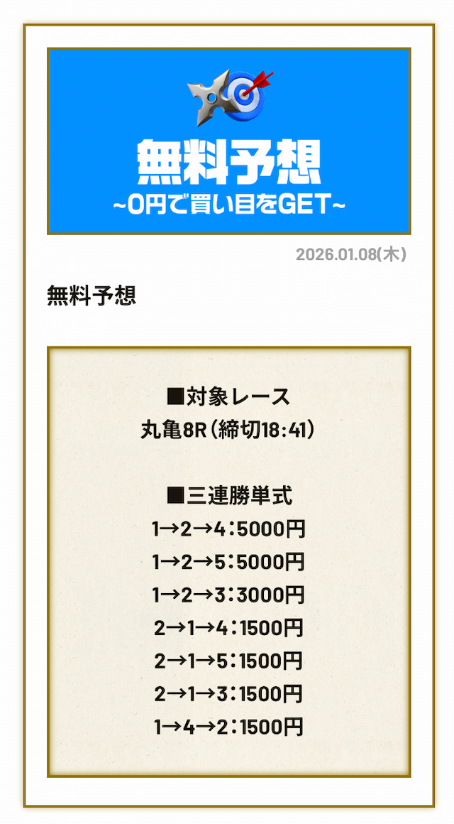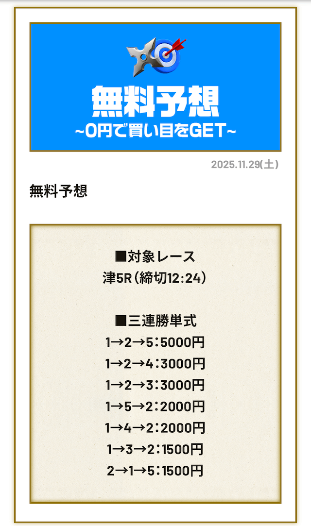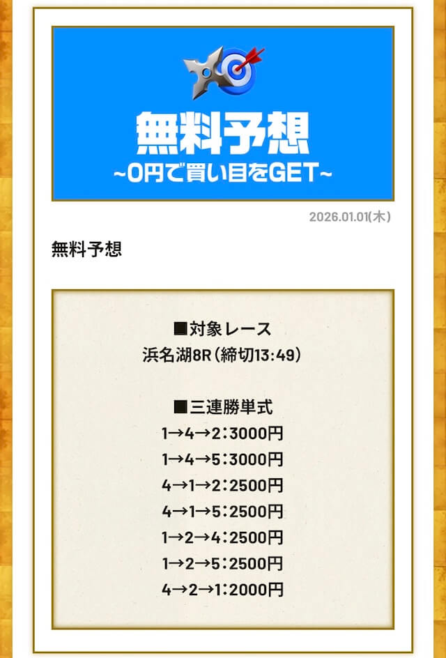 無料予想4回、有料予想1回利用しましたが、かなりおすすめです!登録特典もあるしお得に有料予想に参加できるのですぐに5万円くらいゲットできますよ!
