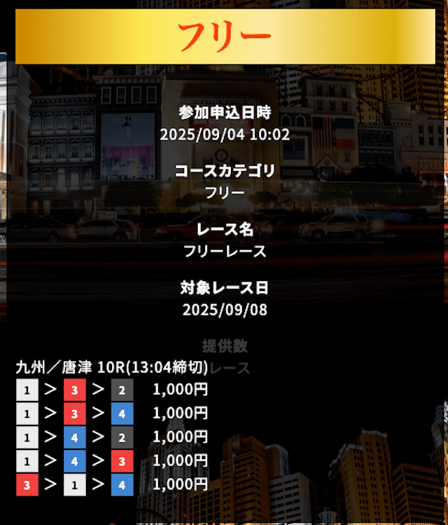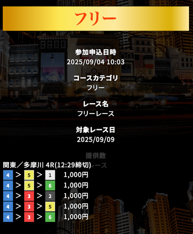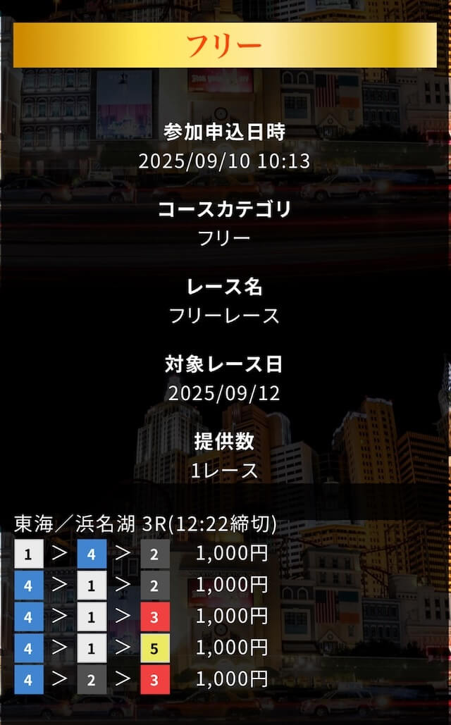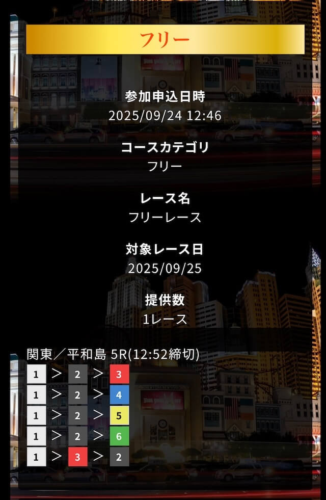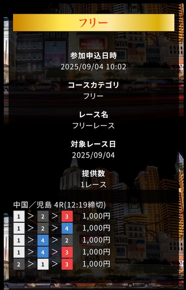エコノミー(デイ/ナイター) | 25,000円 | 250,000円 | 10.00倍 | 2レースコロガシ |