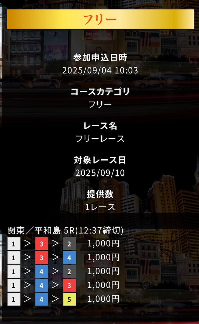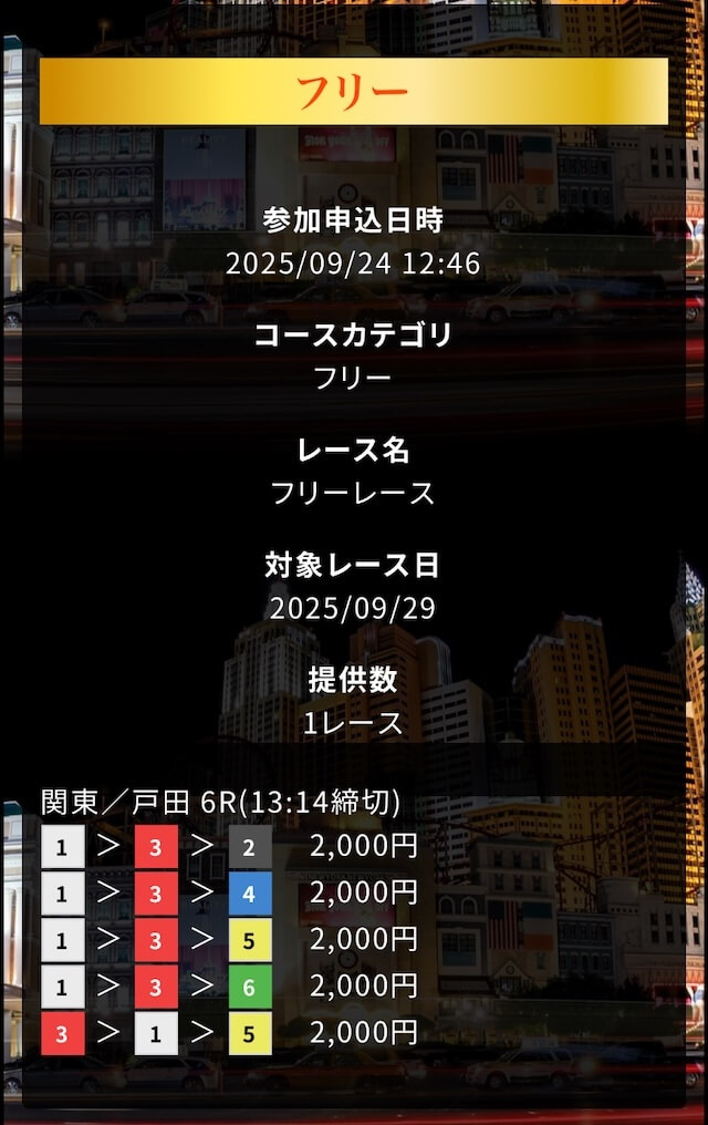 日帰り旅行 | 12,000円 | 50,000円 | 4.17倍 | 1レース単発 |