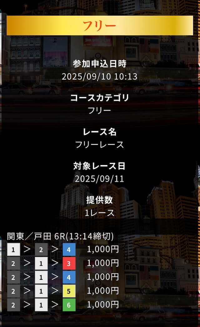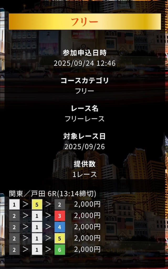 スイート(デイ/ナイター) | 200,000円 | 2,000,000円 | 10.00倍 | 2レースコロガシ |