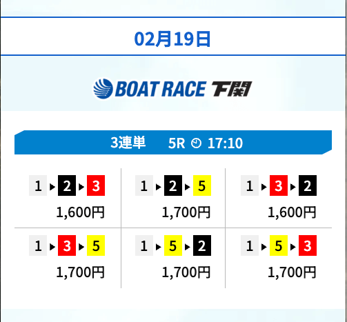 | 01月05日下関06R | 1-2-3 | 9,600円 | 12,480円 | 130% | |