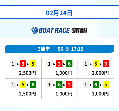 | 02月24日蒲郡05R | 1-5-6 | 10,000円 | 16,750円 | 168% | |