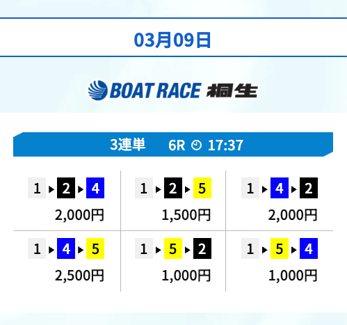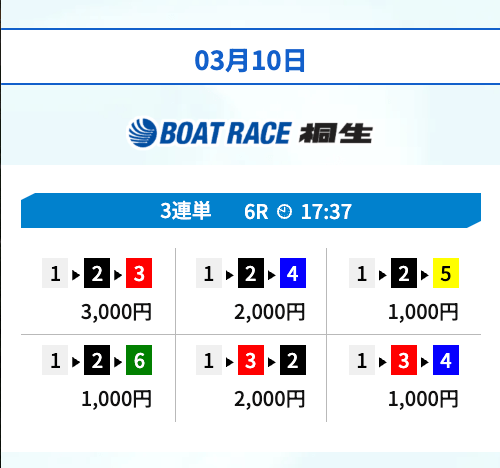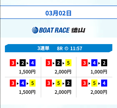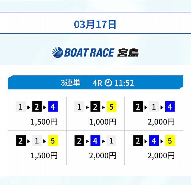 | 03月17日宮島04R | 2-1-5 | 10,000円 | 22,650円 | 227% | |