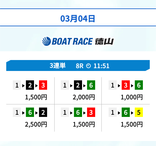 | 03月04日徳山08R | 1-6-5 | 10,000円 | 19,200円 | 192% | |