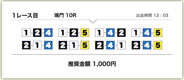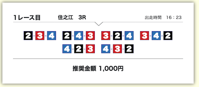 | 12月15日鳴門10R | 2-3-4 | 10,000円 | 19,500円 | 195% | |