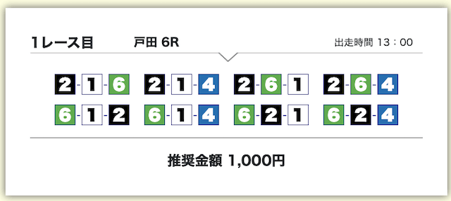 | 06月04日戸田06R | 1-4-2 | 10,000円 | 24,600円 | 246% | |