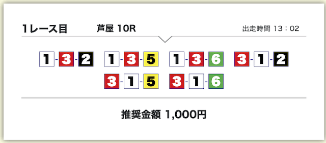 | 04月01日芦屋10R | 1-5-3 | 10,000円 | 12,200円 | 122% | |