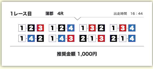 | 06月12日蒲郡04R | 1-2-3 | 9,000円 | 16,700円 | 186% | |