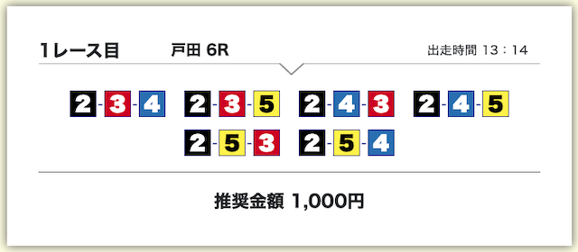 | 02月10日戸田06R | 2-3-5 | 6,000円 | 14,300円 | 238% | |