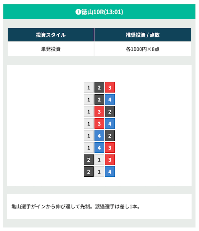 | 01月09日児島12R | 1-3-2 | 10,000円 | 10,500円 | 105% | |