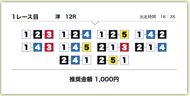| 08月10日浜名湖12R | 3-1-4 | 10,000円 | 35,100円 | 351% | |