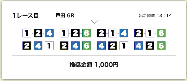 | 03月12日戸田06R | 3-1-6 | 9,000円 | 12,700円 | 141% | |