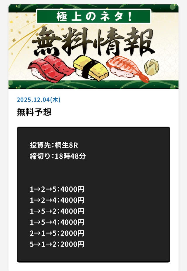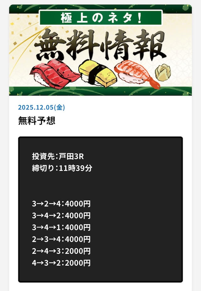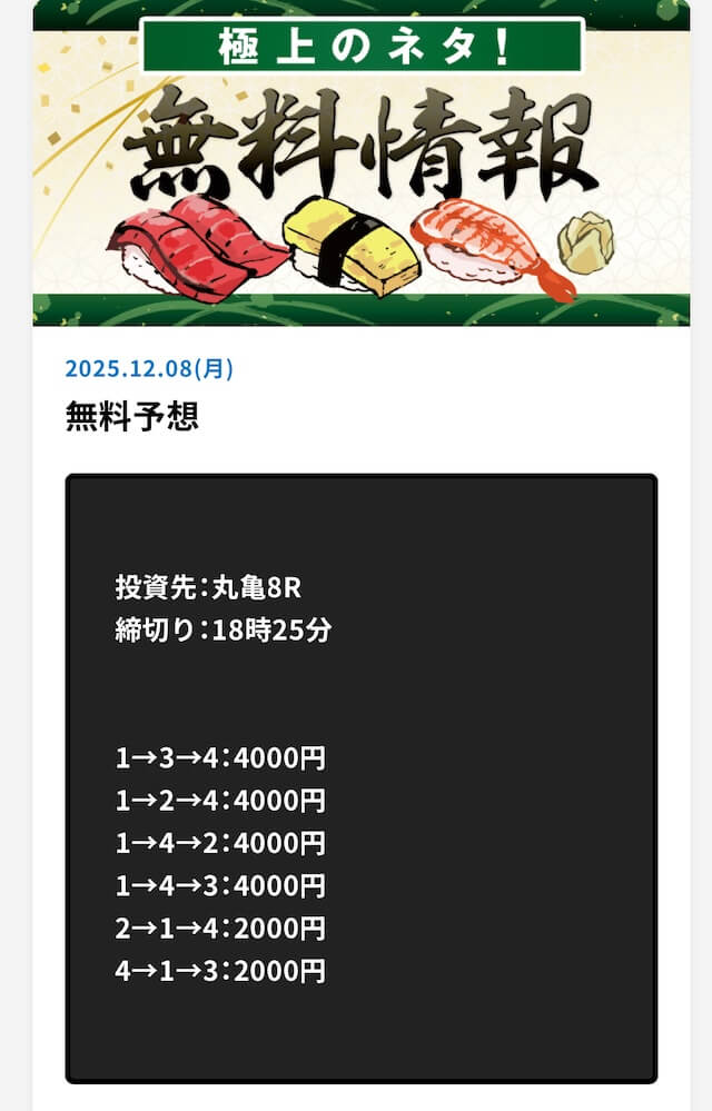 詐欺だね。金返してほしい。4回参加して合計で10万円以上負けてる。まじでどうなってんだよ。しかも有料予想の「長門」ってプランに59,800円も払ったのに、これも大ハズレ。退会するわ。絶対に登録しないように!