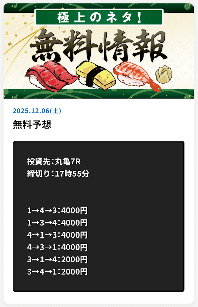 | 12月06日丸亀05R | 1-2-4 | 20,000円 | 42,400円 | 212% | |