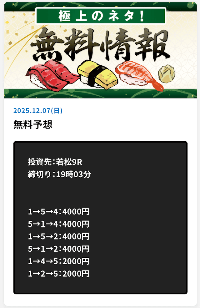 | 09月09日若松12R | 1-2-5 | 20,000円 | 45,200円 | 226% | |