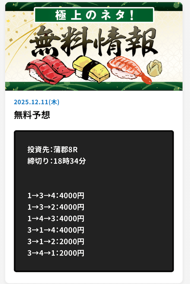 | 戦績 | 69戦57勝12敗 | 的中率 | 83% | 回収率 | 193% |