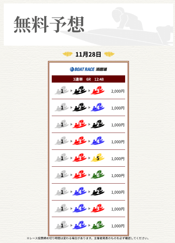 | 11月28日浜名湖05R | 2-1-5 | 20,000円 | 0円 | 0% | |