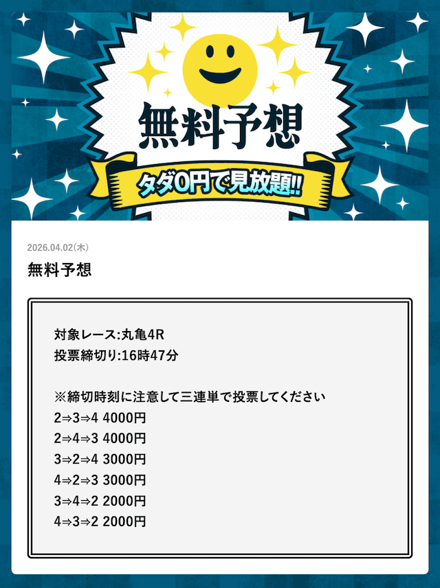 幸せボートレースの無料予想は1日あたり2レース公開。