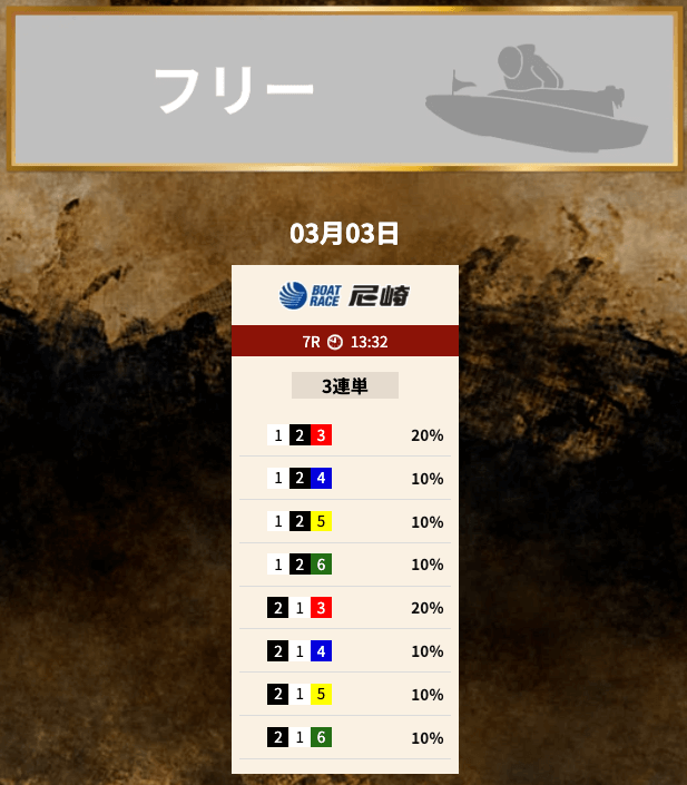 幸せボートレースの無料予想は、インコースを中心とした軸に王道の組み立てをした予想を多く公開しているのが特徴です。