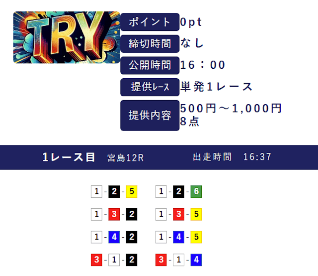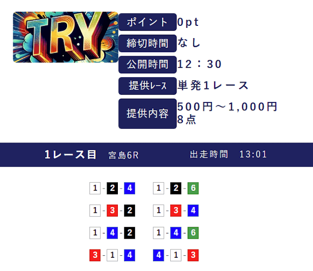 人気決着でもそこそこ配当が付くレースに参加してるからトリガミはまずないな。最低でも10倍以上は付いてる印象。合計8,000円で1点1,000円だから間違いなく利益を増やしていける。