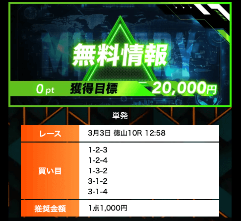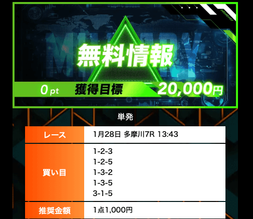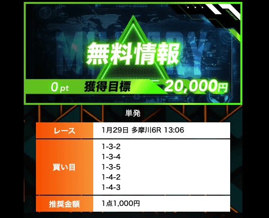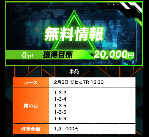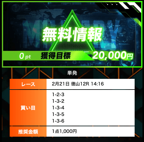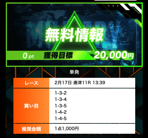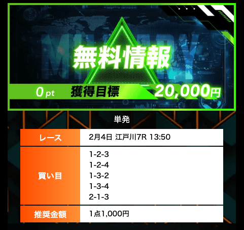 - 無料予想では、オッズ20倍のレースの的確に見抜いており、参考になる