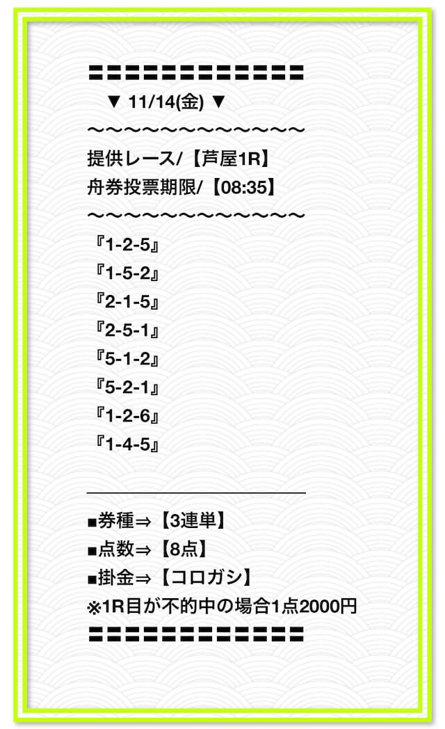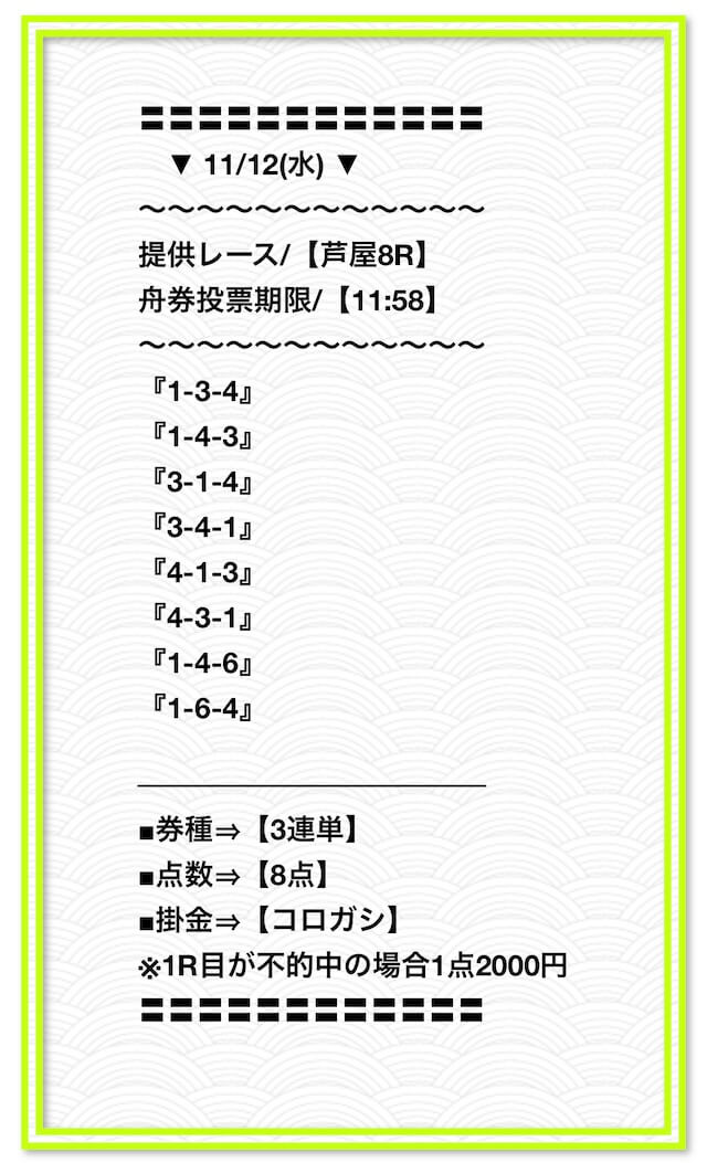 | 宮島 | 11/15 | 73.3% | +46,900円 |