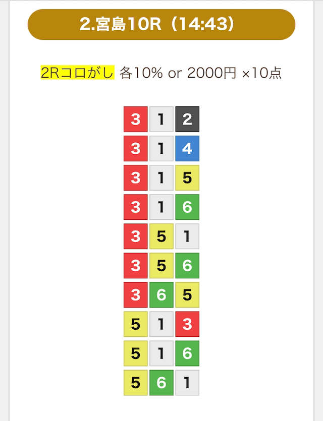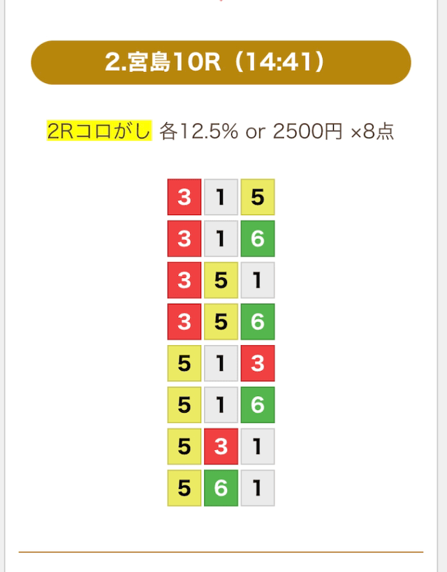 | 10月31日宮島11R | 1-3-4 | 8,000円 | 12,500円 | 156% | |