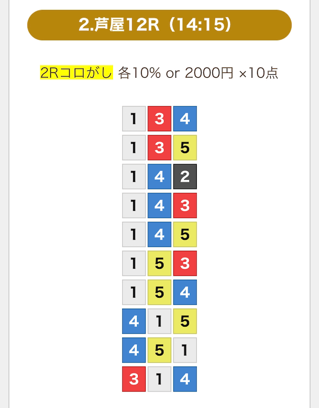 | 10月27日芦屋12R | 1-4-3 | 8,000円 | 19,600円 | 245% | |