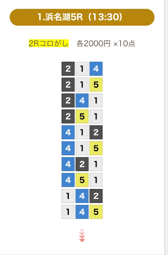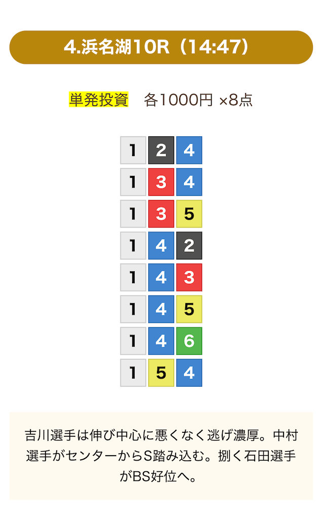 | 10月01日浜名湖04R | 1-2-4 | 8,000円 | 24,300円 | 304% | |